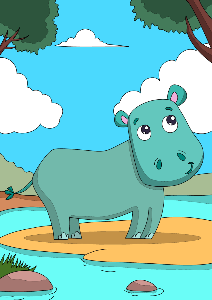 ​In a bright valley where a sparkling blue river flowed past tall green trees, lived a friendly hippo named Hugo. Hugo had smooth, teal-colored skin, tiny ears, and very kind eyes. He spent most of his days standing happily in the shallow water, looking up at the fluffy white clouds in the sky.