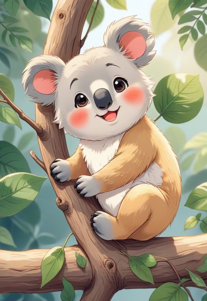 Far away, in a sunny forest filled with the lush green leaves of eucalyptus trees, lived a tiny, fluffy, and very cute koala named Koko. Koko had a soft white belly, beige fur, and rosy cheeks. His favorite things were eating eucalyptus leaves with his mother and napping on the highest branches of the trees.But today, Koko wanted to be a little mischievous. As soon as he woke up, he thought, “I’m going to do something different today!” He quietly slipped off the branch without waking his mother and ventured deeper into the forest to start a day full of adventure.First, he saw a giant butterfly. Its wings were the colors of the rainbow, and Koko began to hop, following it. The butterfly landed from branch to branch, from flower to flower, and Koko ran after it. But the butterfly was too fast, and Koko’s little legs were already tired.Then, he heard a strange sound coming from the ground. When he went towards the sound, he saw a hole in the earth. Curiously, he poked his head into the hole, and out popped a rabbit! The rabbit asked, “Hello Koala Koko! What are you doing here?” Koko excitedly said, “I’mlooking for adventure!” The rabbit smiled and said, “Then come, I’ll show you the most delicious berries in the forest!”Koko and the rabbit started collecting berries together. The berries were so sweet that Koko thought he had never eaten anything so delicious before. After their bellies were full, they came to the edge of a river. Koko had never seen such a large body of water before. The rabbit said, “Fish live here!” And as Koko looked into the water, he saw tiny, shimmering fish swimming.The sun began to set. The sky was filled with orange and pink colors. Koko had had a lot of fun but he also missed his mother. He thanked the rabbit and said goodbye, heading back home.His mother was very happy to see Koko. Koko hugged his mother and told her all about the adventures he had during the day. His mother stroked Koko’s cheeks and said, “You had a wonderful day, my little Koala!”That night, Koko slept soundly next to his mother on the eucalyptus branch, dreaming of butterflies, rabbits, delicious berries, and shimmering fish. And he knew that tomorrow, he would wake up to a new day, and perhaps new adventures would be waiting for him. But this time, he would let his mother know!