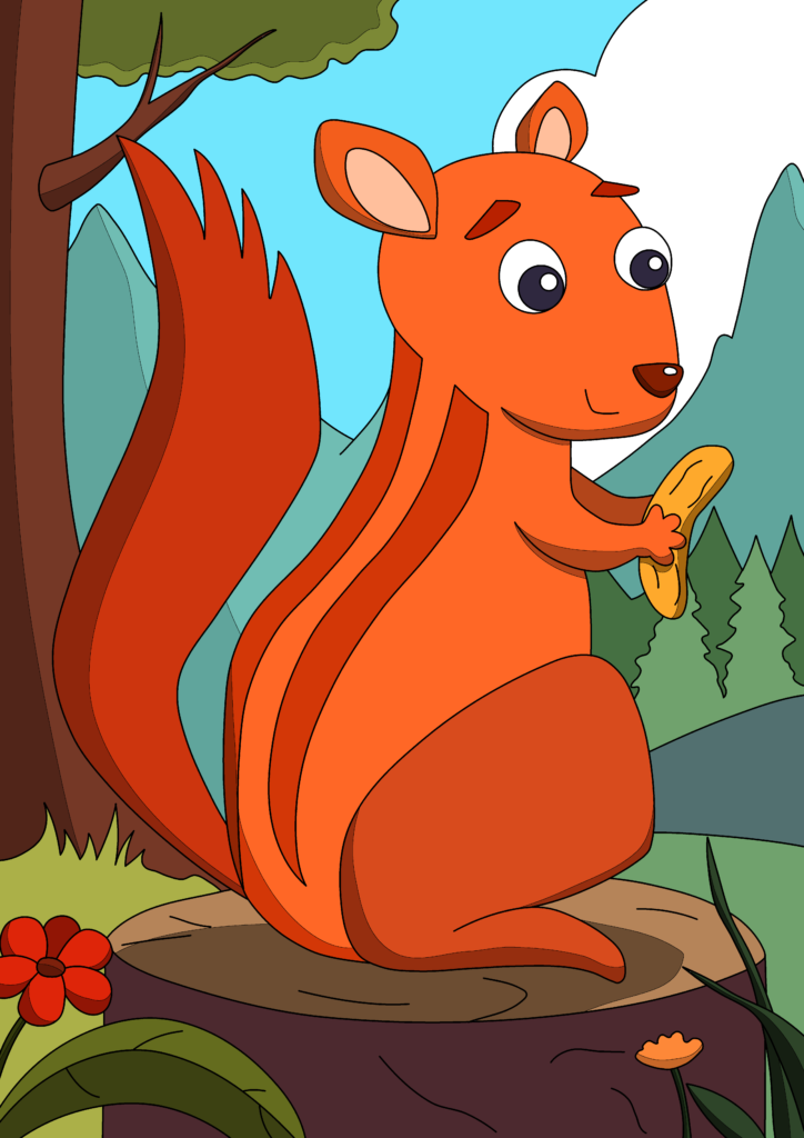 ​In a lush green forest, right at the edge of the tall pine trees and big blue mountains, lived a busy squirrel named Sammy. Sammy had bright orange fur, a very big bushy tail, and a pair of sparkling, curious eyes.